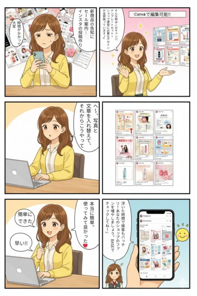 今回、shopの彩音さんに、誰でも簡単にプロ級の投稿が作れる「魔法のテンプレート」の使い方を4コマ漫画で解説してもらいました! 投稿作りのストレスを減らして、もっと楽しくショップ運営をするヒントが詰まっています。ぜひチェックしてみてくださいね。