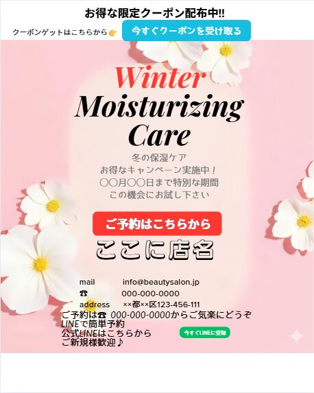 - クーポン配布用テンプレート:初回限定割引や友達紹介クーポンを配布
