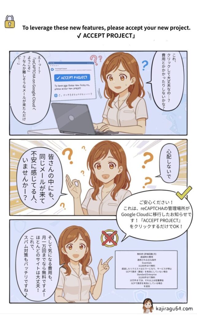 ウェブサイト管理者や開発者の皆様へ。Googleから「reCAPTCHA on Google Cloud へようこそ」というメールが届き、「Accept Project」という青いボタンを見て不安になっていませんか?